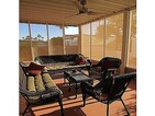 This beautifully maintained 18x53, 2-BEDROOM - 2-BATH CAVCO manufactured home is roomier than a park unit. *****Features a bright open floor plan w/neutral finishes, easy care LAMINATE WOOD-LOOK FLOORING throughout, 9 FOOT CEILINGS and LARGE WINDOWS that provide lots of natural light. *****Entrance is at ground level: no stairs or steps. The fully furnished interior offers effortless comfort & style from day one. ***** SPLIT LAYOUT ... master bed/bath at the rear, spare bed/bath at the front. Both baths feature walk-in showers: shower in master has built-in seats. *****QUEEN-SIZED BED bed in the master. Day bed in the spare room can be used as TWO TWINS or KING-SIZED BED ***** Home is complete with all major appliances and propane BBQ. *****Enjoy your morning coffee in the 24x12 SCREENED-IN ARIZONA ROOM or FRONT PATIO. A covered carport with EXTENDED DRIVEWAY gives additional parking. *****THE PARK ... Located close to freeways and shopping. Hacienda De Valencia is a welcoming 55+ community. Residents enjoy two heated pools, a relaxing spa, a large clubhouse for events and activities, a fitness center, billiards, shuffleboard courts, library, media room, picnic areas, and on-site management. Additional conveniences include RV storage, laundry facilities, a dog park, and beautifully maintained common areas. Water, sewer, and trash are bundled into one easy bill with the lot rent. This home is move -in ready and waiting for you to arrive. Just bring your toothbrush!